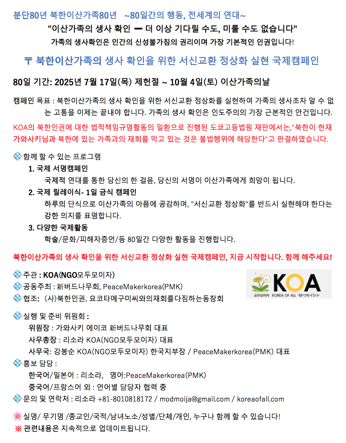 이산가족의 생사확인을 위한 서신교환 정상화 실현 80일간(2025.7.17~10.4)의 국제캠페인