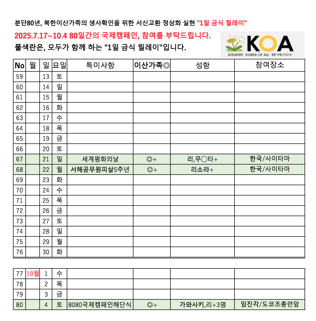 10월 4일까지의 80일기간에 "1일 릴레이 금식"에 참여가능하신 일자를 보내주시기를 바랍니다.