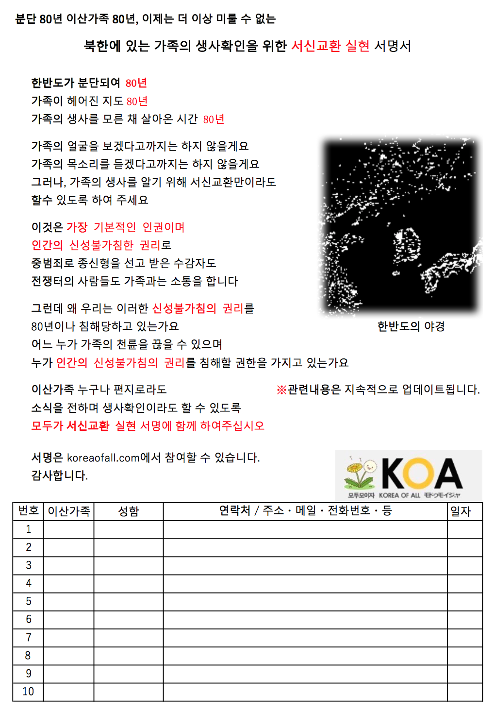 세계 유일의 분단국가-한반도! 가족의 생사확인을 위한 서명활동에 참여해주십시요!