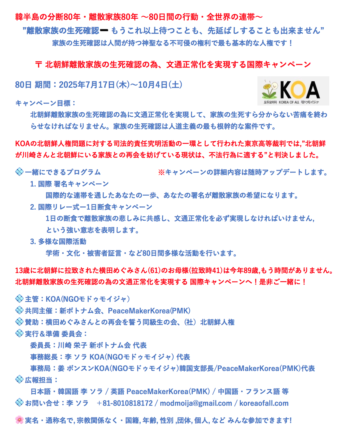 이산가족의 생사확인을 위한 서신교환 정상화 실현 80일간(2025.7.17~10.4)의 국제캠페인