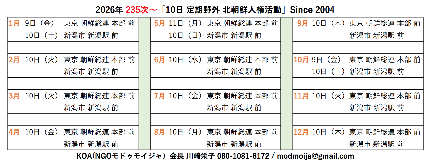 2026年 KOA(NGOモドゥモイジャ)の235次〜「10日 定期野外 北朝鮮人権活動」日程表