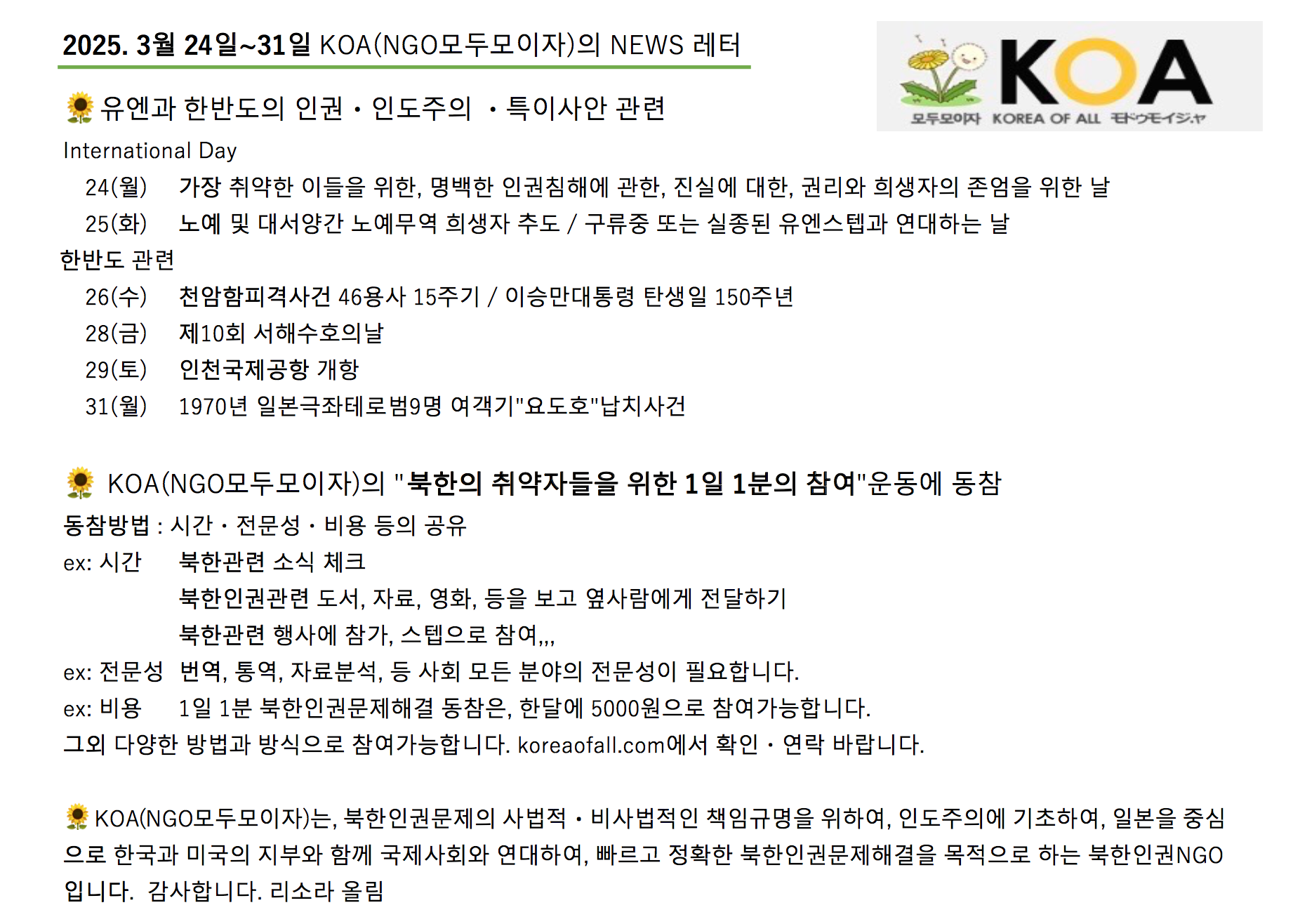 2025년 3월 24일~ 3월 31일 KOA(NGO모두모이자)의 뉴스레터