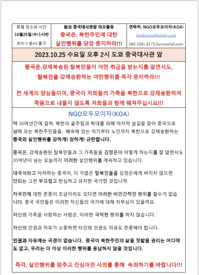 2023.10.25 수 오후 2시 주일중국대사관 앞 데모활동
